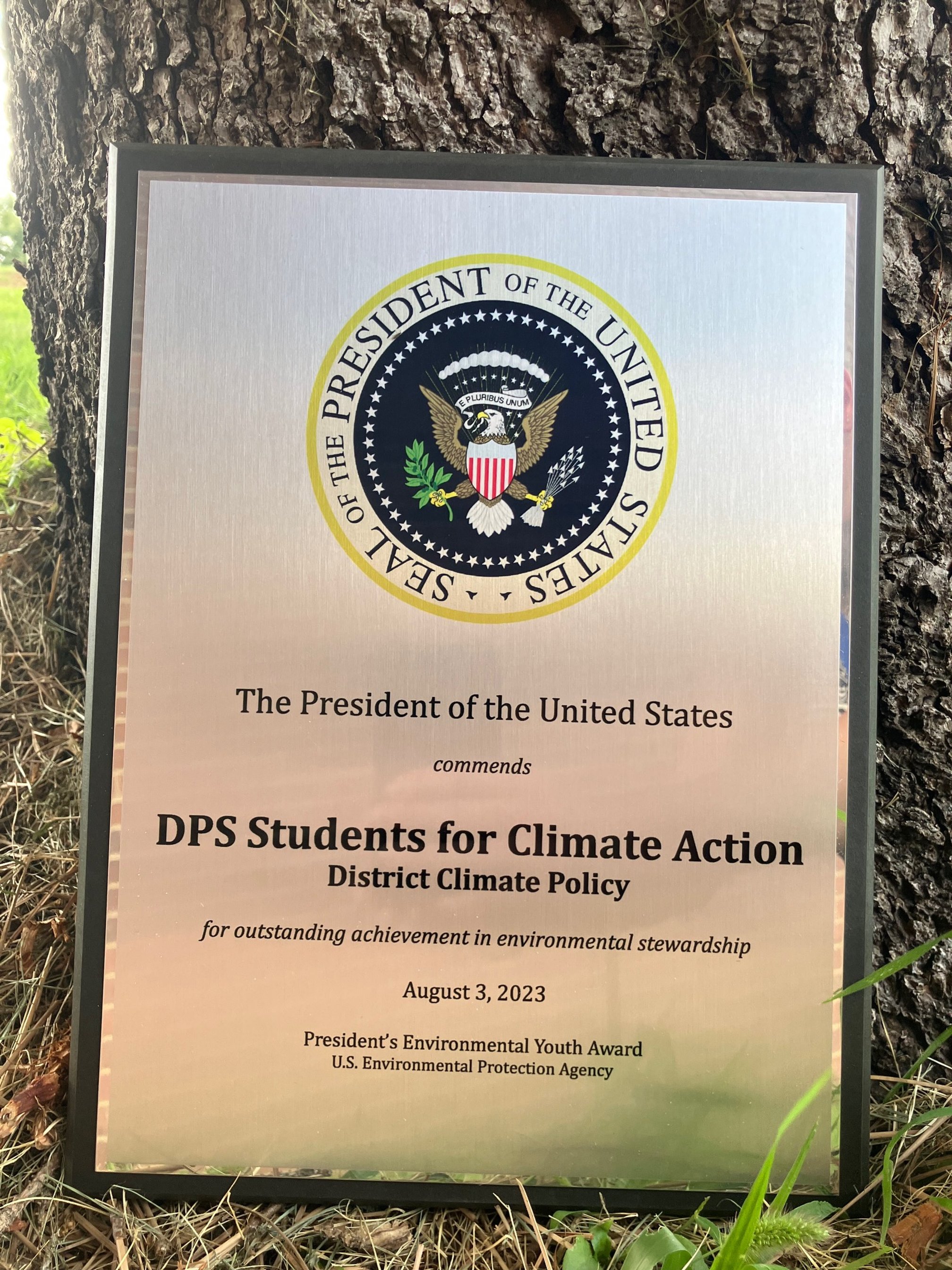 DPS Students for Climate Action is a student-led organization founded by students in 2021. We worked for almost two years to pass a Climate Action policy in DPS, followed by a 100+ page Climate Action Plan. We won the President’s Environmental Youth Award and were honored to meet Vice President Kamala Harris. However, our work is far from done, as our new mission is to ensure student voice and engagement are at the forefront of implementing the Climate Action Plan (CAP).